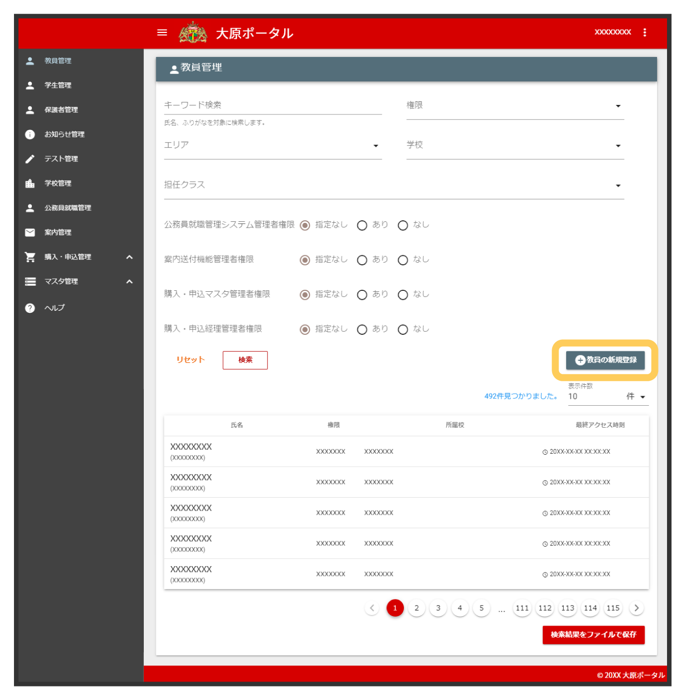 | 教員の新規登録 | 〇(所属エリア内のB権限以下の教員) |